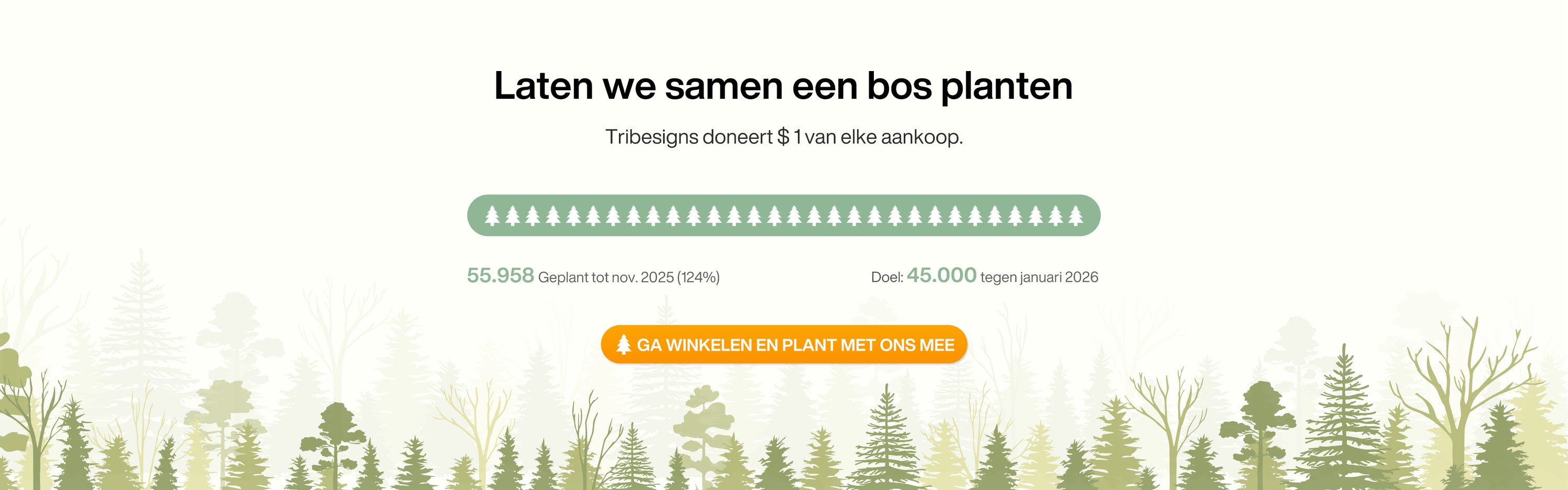 - Voor elke bestelling die op onze officiële website geplaatst wordt, plant Tribesign een boom via het Boomplantprogramma.