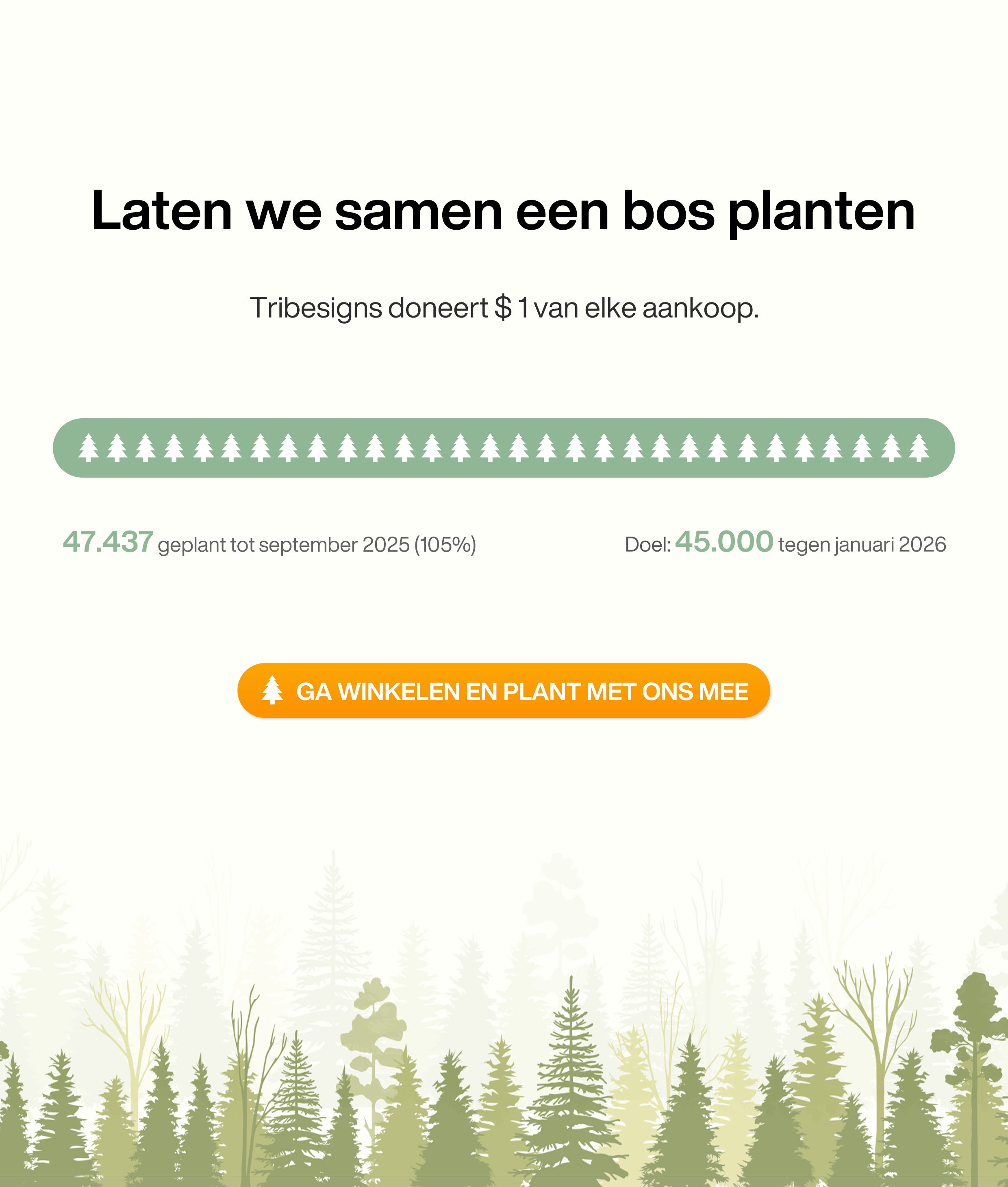 - Voor elke bestelling die op onze officiële website geplaatst wordt, plant Tribesign een boom via het Boomplantprogramma.